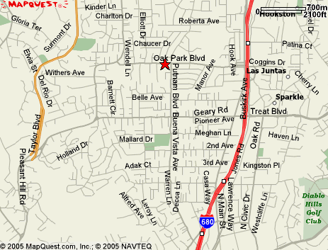 3)In one long block you will approach an overpass which crosses the highway and North Main. There are lights immediately before and after the overpass. 4)Turn left at the traffic light after the overpass. This access road is not named, but does have a small sign labelled "To Oak Park Blvd" 5)Stay in the right lane on this access road, A quarter circle takes you to Oak Park Blvd. Turn right onto Oak Park. 6)We are located at 1922 Oak Park Blvd, approx. one half mile down on the right, in a strip mall named Oak Park Center halfway down the mall parking lot. This center is past the public library, a Safeway & the intersection of Oak Park with Patterson/Putnam. Call for directions (925) 944-0402